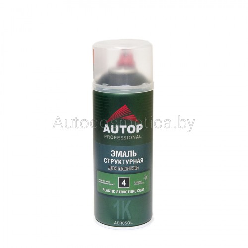 Быстросохнущая структурная эмаль AUTOP №4, Plastic Structure Coat ATP-A07583 черного цвета с мелкой структурой предназначена для создания рельефной поверхности при ремонтной покраске пластиковых деталей автомобилей. Воспроизводит оригинальную заводскую текстуру. Скрывает неровности и участки локального ремонта. Покрытие устойчиво к механическим повреждениям и атмосферным воздействиям. Рекомендуется наносить на AUTOP No2 «Грунт адгезионный для пластика» или на AUTOP «Грунт-наполнитель для пластика №3».
