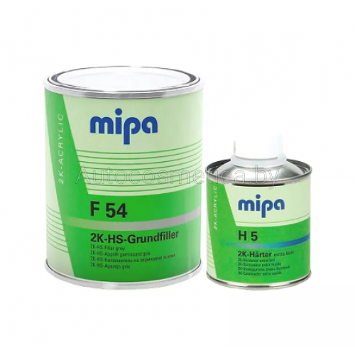 Mipa F54 HS — это двухкомпонентный акриловый грунт-наполнитель класса High Solid (HS), что указывает на высокое содержание сухого остатка. Продукт поставляется в виде комплекта объемом 1.25 литра (1 л грунта и 0.25 л отвердителя) и предназначен для профессионального кузовного ремонта. Серый цвет грунта является универсальной подложкой для большинства финишных эмалей.