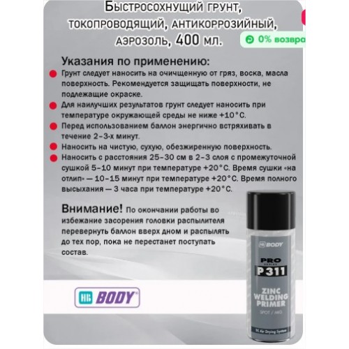 Специальный антикоррозийный токопроводящий грунт для точечной сварки с большим содержанием цинка. Благодаря отсутствию хроматов цинка и свинца является полностью безопасным. Body 425 изготовлен на основе комбинации акриловых смол с добавлением цинка. Применяется на поверхностях, предназначенных для контактно-точечной сварке (SPOT) и дуговой сварке плавящимся металлическим электродом в среде инертного газа (MIG).