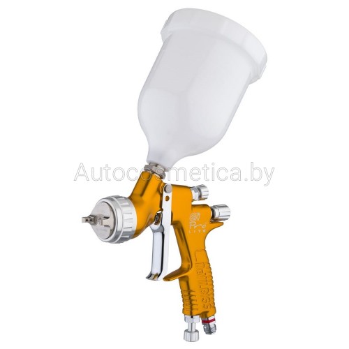 Означает супер легкий, всего 446 граммов, что обеспечивает комфортную длительную работу. Универсальный корпус позволяет использовать его с различными воздушными головами, которые условно можно разделить на «базовые», «лаковые» и «универсальные». С их помощью можно подобрать оборудование для наибольшей точности цветопередачи, а так же для скоростной работы, либо для экономии краски. Кроме того, можно скомплектовать краскопульт DeVilbiss GTi PRO Lite - GTE10 с очень маленьким потреблением воздуха, что бывает очень важно для маленьких мастерских со слабыми компрессорами.